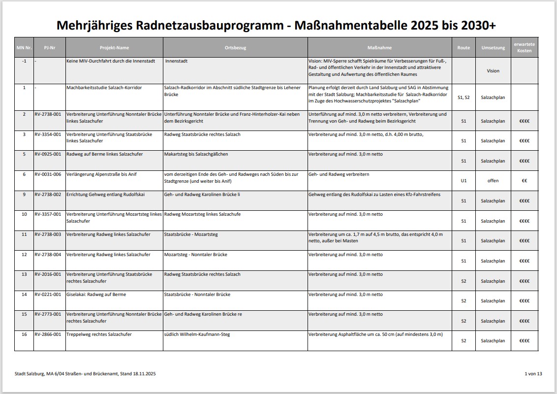 Mit der neuen Radstrategie 2030+ und einem mehrjährigen Radnetzausbauprogramm will die Stadt Salzburg den Anteil der Radfahrten bis 2030 auf 30 Prozent steigen. Das Straßen- und Brückenamt der Stadt Salzburg hat einen Katalog mit rund 200 Radwegbaumaßnahmen für den Zeitraum 2026 bis 2030 erarbeitet, der dem Gemeinderat am 10. Dezember 2025 zur Beschlussfassung vorgelegt wird. Das Programm löst den alten Maßnahmenkatalog von 2019 ab, der sich auf Hauptrouten beschränkte, und umfasst nun das gesamte Radwegenetz im Stadtgebiet. Projekte, die noch nicht umgesetzt wurden, sind neu bewertet und wo erforderlich angepasst worden. 52 zusätzliche Maßnahmen sind neu.
